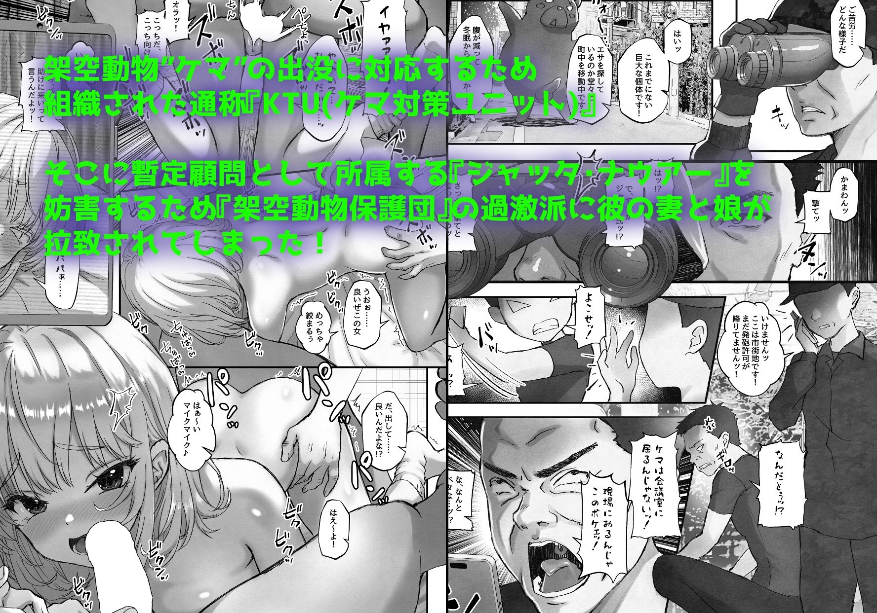 サークル「そんなのあとの祭りじゃないですか」の同人エロ漫画「どんぶり親子ぶち切れ過激派架空動物保護団に24時間連続輪〇されちゃう話。」です。
